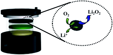 The catalytic activity of a cathode material plays a vital role in determining the electrochemical performance of Li–O2 batteries. Herein, N-doped mesoporous carbon-supported CoO@Co nanoparticles are prepared in situusing the ionic liquid (IL) 1-butyl-3-methylimidazolium tetrachlorocobalt ([BMIm]2[CoCl4]) as the precursor with silica as the hard template. The material was characterized by TGA, BET, XRD, TEM, XPS, and H2-TPR. After exposure to air, the species on the surface of the Co is CoO, as verified by XPS. The pore size is about 2 nm, and the CoO@Co nanoparticles were irregularly shaped and sized in the range of 20–300 nm, which may have been due to the aggregation of ultrafine nanoparticles. The existence of an interaction between the CoO@Co nanoparticles and the N-doped support is confirmed by XPS and H2-TPR. The catalyst shows superior activity for oxygen evolution reaction (OER) manifested in its lower charge potential (3.75 V at the current density of 100 mA g−1). Enhanced performances in coulombic efficiency, rate capability, and cycling stability (55 cycles) are also realized. Finally, these improvements, with the exception of the catalytic activity of CoO, may benefit from the interaction between the carbon supporter and the CoO@Co nanoparticles.